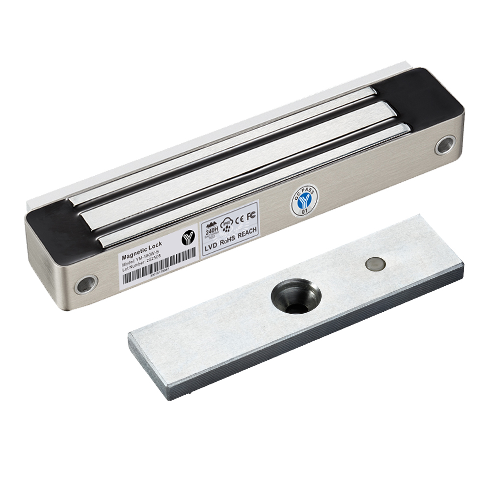 YM-180W-S The waterproof single-door magnetic lock with signal output is designed for metal doors, wooden doors, fireproof doors, glass doors, it's IP-68 rated, can be used outdoors and environment with high humidity and high salinity. Anti-drop steel cables are provided on both sides of the lock body. There is a set of lock status signal (NO/COM) output contacts. YLl magnetic lock cores are produced with robotic laser welding technology, providing 2 to 3 times stronger impact resistance and torsional resistance than conventional production processes. The surface is treated with the internationally leading electroplating process and the lock itself has passed the 240-hour salt spray test in the national laboratory, achieving excellent performance of anti-oxidation, anti-rust and anti-corrosion. Our company offers a complete range of brackets for different locks.