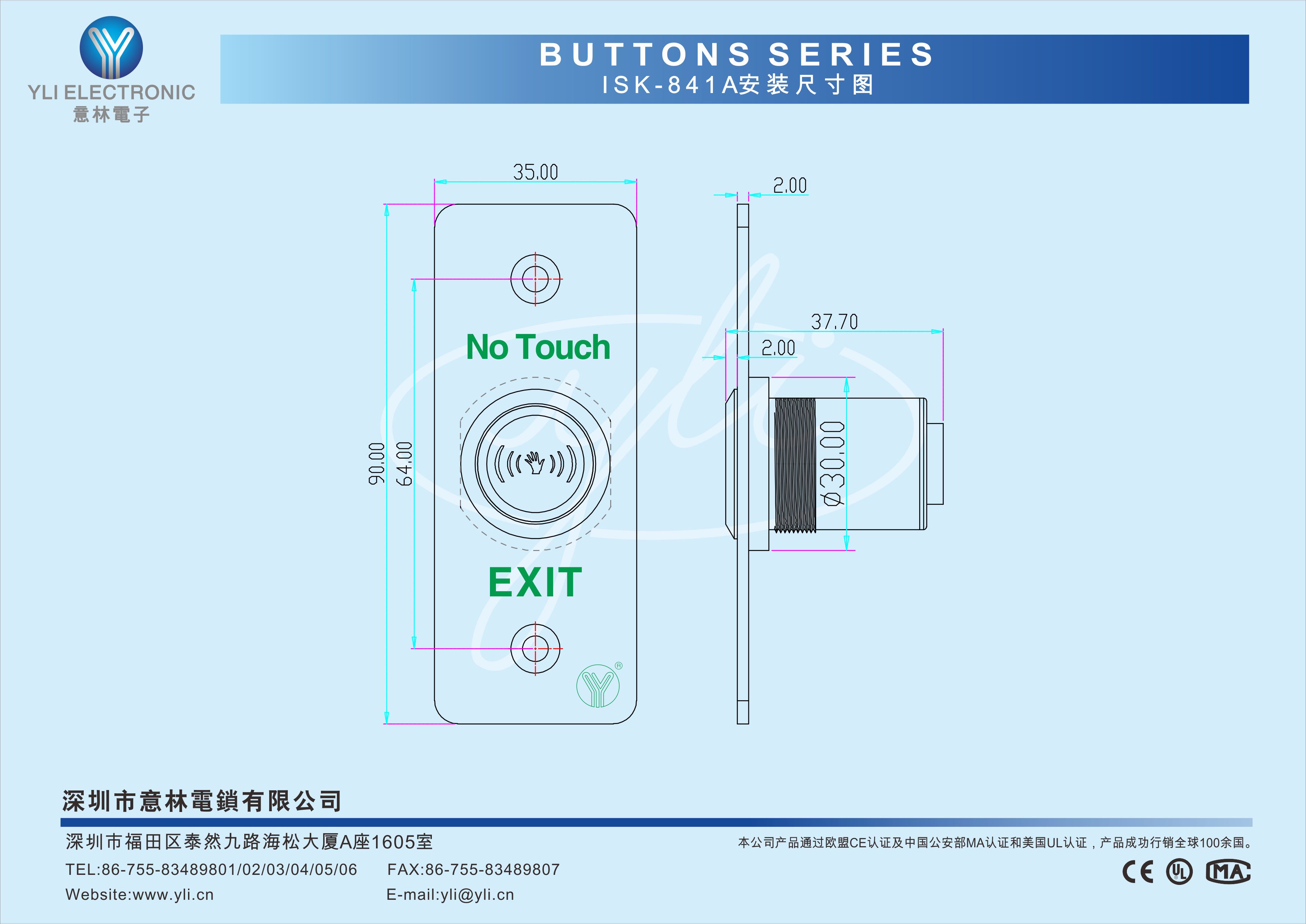 ISK-841A(LED) 是一款紅外感應窄框門禁開關, 具有延時可調功能及紅外感應功能,感應距離4-12cm可調。LED燈顯示: 紅色待機狀態; 綠色動作狀態。采用304不銹鋼拉絲工藝處理,耐磨抗沖擊,堅固耐用。適用于智能樓宇、住宅小區、辦公樓、酒店、醫院、體育館等場所使用。