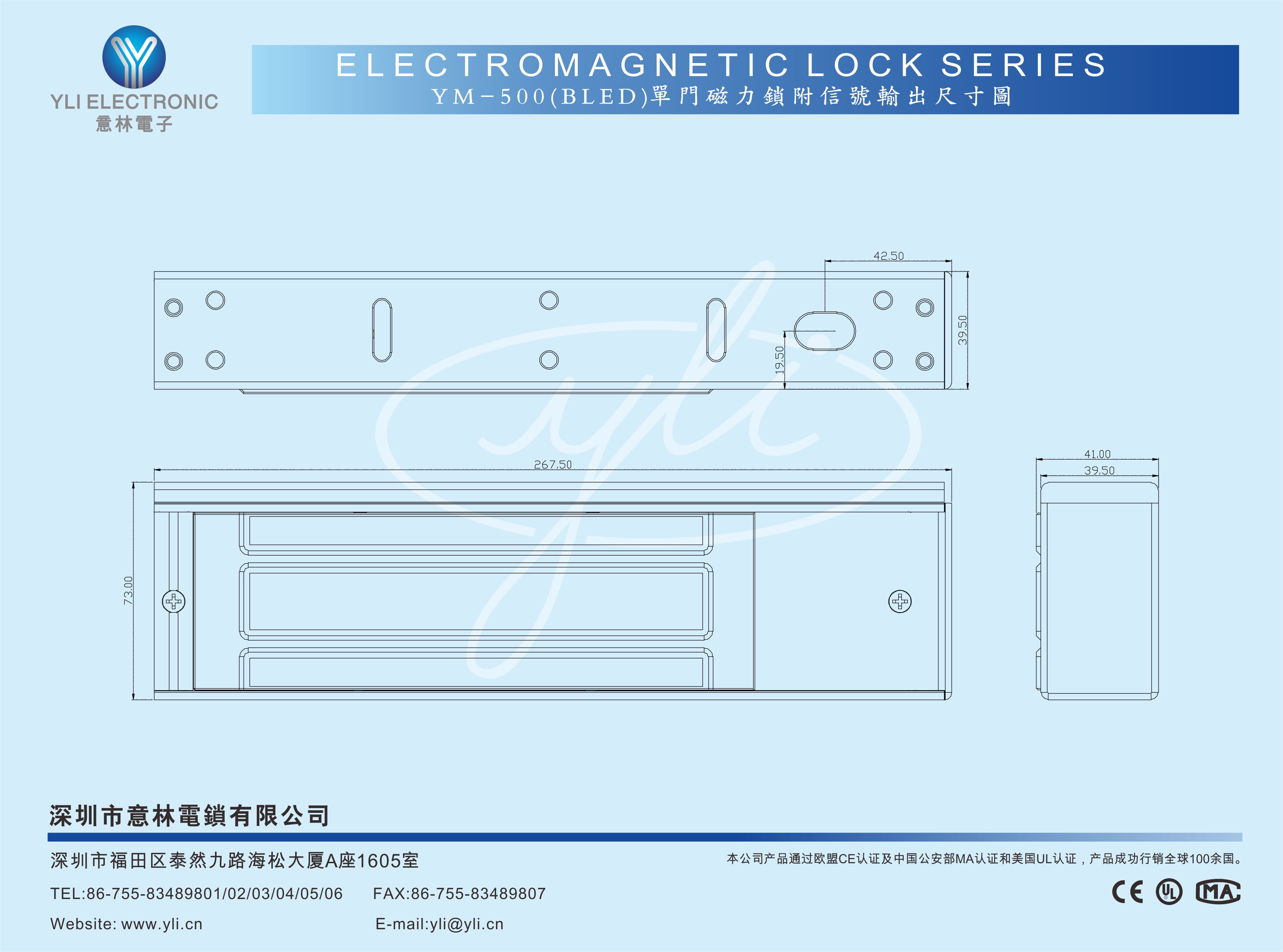 YM-500(BLED)單門磁力鎖附信號輸出(大LED顯示)是針對木門、金屬門、玻璃門、防火門等設(shè)計的。設(shè)有一組鎖狀態(tài)信號(NO/NC/COM)輸出接點,為門禁系統(tǒng)實時反饋信息,鎖體側(cè)面設(shè)有加大LED燈顯示,綠燈開鎖,紅燈上鎖。意林磁力鎖加大電磁吸力設(shè)計,吸力超強(qiáng),鎖芯特殊加強(qiáng)焊接工藝,抗撞擊力及抗扭力比常規(guī)生產(chǎn)工藝強(qiáng)2-3倍,更堅固耐用。表面處理采用國際領(lǐng)先的電鍍工藝,通過國家實驗室240小時鹽霧測試,達(dá)到防氧化、防銹、防腐性能。適用于日常辦公場所或沿海鹽霧,潮濕(如:地鐵,機(jī)場,核電站,跨海大橋,港口碼頭,醫(yī)療機(jī)構(gòu),沿海城市建筑)等場景使用。本公司產(chǎn)品規(guī)格及配套齊全,內(nèi)開式門或無框玻璃門、窄框門等均有安裝支架配套,有效滿足現(xiàn)代智能建筑的各種場景需求。